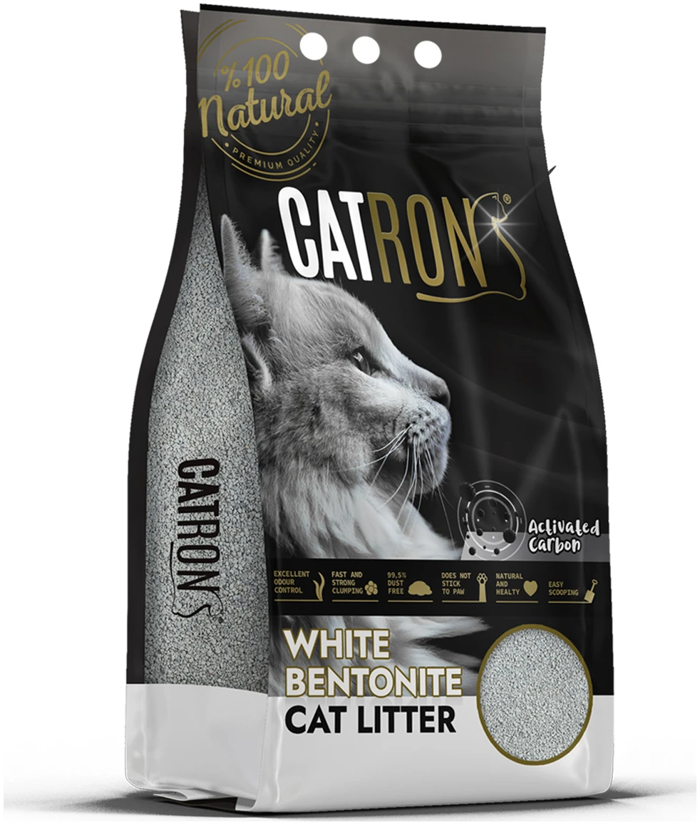 Arena aglomerante blanca CatRon con un ligero aroma a Carbón Activado que perdura en el tiempo. La arena CatRon es arcilla 100% natural (bentonita). Tiene una capacidad de absorción máxima, con endurecimiento instantáneo, lo que facilita la limpieza de la caja sin dejar residuos contaminados, por lo que es extremadamente económico. Cuando lo limpias solo elimina la arena sucia, la arena limpia permanece en la bandeja con una apariencia limpia. Al ser un producto natural inerte, evita el desarrollo de bacterias.
