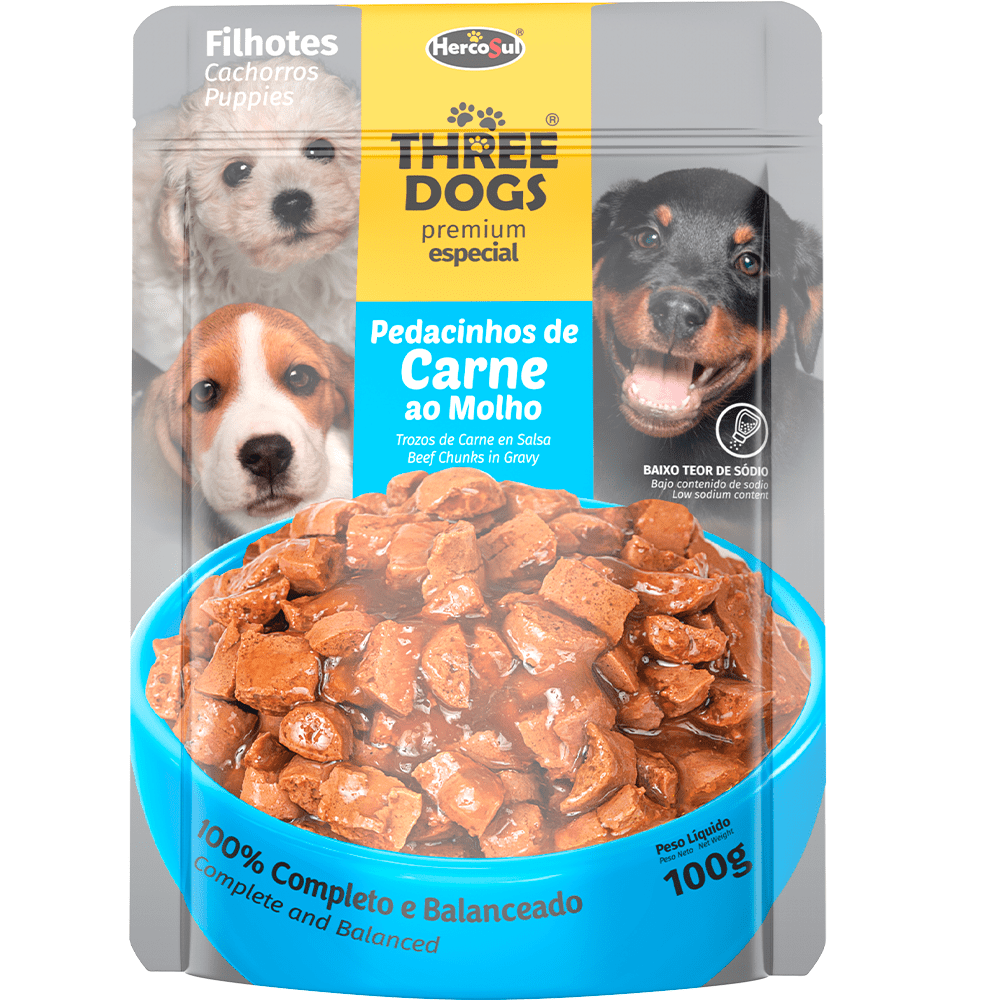 ¡El sachet Three Dogs Premium Especial Cachorros es un alimento 100% completo y equilibrado bajo en sodio con cantidades ideales de vitaminas y minerales para promover un crecimiento saludable y equilibrado! ¡Con textura y sabor que los cachorros amarán!